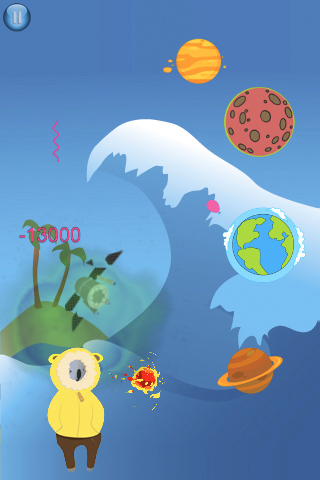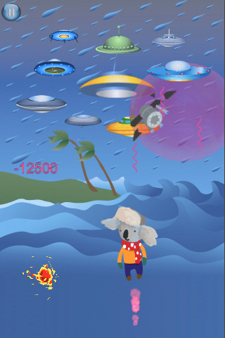 Tilt your device to navigate the koala across forty-six scenes. Tap your finger on the screen to place aliens and monsters in bubbles. Collisions with space junk and burning meteorites will force the current scene to start over and cost points. Tap the pause button to place the game on hold. Several menus allow access to game information, sound settings, scores, unlocked scenes, gifts, and other games.