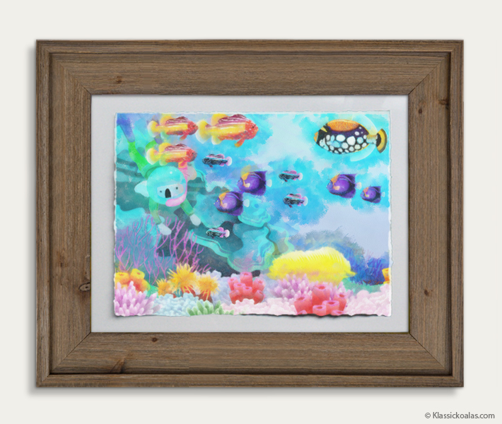 Fashioned after a scene from our game Aqua Koalas, this image is painted in a manner reminiscent of traditional watercolor techniques and virtually indistinguishable from expensive commissions. Arriving at your door, is a professionally mounted barn wood frame with a clear glazing that is crack resistant during transit. Solid framing methods ensure the work is well-protected for generations to come, if kept inside of a home with temperate conditions. Please avoid exposure to extreme heat or dropping the artwork on the floor.