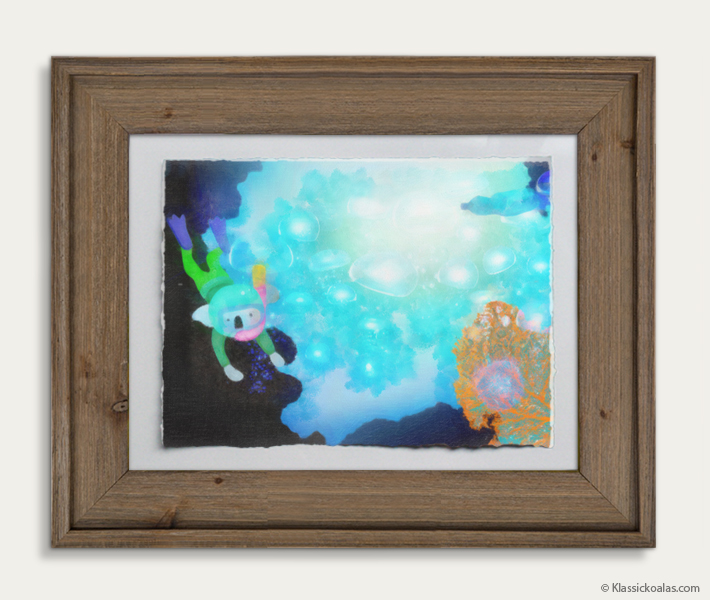 Fashioned after a scene from our game Aqua Koalas, this image is painted in a manner reminiscent of traditional watercolor techniques and virtually indistinguishable from expensive commissions. Arriving at your door, is a professionally mounted barn wood frame with a clear glazing that is crack resistant during transit. Solid framing methods ensure the work is well-protected for generations to come, if kept inside of a home with temperate conditions. Please avoid exposure to extreme heat or dropping the artwork on the floor.