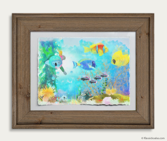 Fashioned after a scene from our game Aqua Koalas, this image is painted in a manner reminiscent of traditional watercolor techniques and virtually indistinguishable from expensive commissions. Arriving at your door, is a professionally mounted barn wood frame with a clear glazing that is crack resistant during transit. Solid framing methods ensure the work is well-protected for generations to come, if kept inside of a home with temperate conditions. Please avoid exposure to extreme heat or dropping the artwork on the floor.