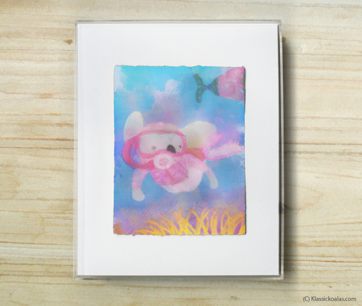 This is an actual watercolor painting fashioned after screens in our Happy Koalas game. Derived from a print, the artwork may also contain a combination of pastel and colored pencil applications. The acid-free, cold pressed watercolor paper gets torn by hand to yield deckled-edges, for a true fine art appeal. Trained artists paint the final image in a manner that is reminiscent of traditional watercolor techniques, rendering it virtually indistinguishable from expensive commissions. The picture is framed in a box art frame designed to avoid contact with the art to help preserve the image. The painting will arrive ready to hang, yet is easily exchangeable with a frame of your own choice. Solid framing methods ensure the work is well-protected for generations to come, if kept inside of a home with temperate conditions. Avoid exposure to extreme heat or dropping the artwork on the floor.