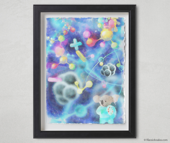 This is an actual watercolor painting fashioned after scenes in our Magic Koalas game. Derived from a print, the artwork may also contain a combination of pastel and colored pencil applications. The acid-free, cold pressed watercolor paper gets torn by hand to yield deckled-edges, for a true fine art appeal. The images gets painted in a manner that is reminiscent of traditional watercolor techniques, rendering it virtually indistinguishable from expensive commissions. The picture is framed in a box art frame designed to avoid contact with the art to help preserve the image. The painting will arrive ready to hang, yet is easily interchangeable with a frame of your own choice. Solid framing methods ensure the work is well-protected for generations to come, if kept inside of a home with temperate conditions. Avoid exposure to extreme heat or dropping the artwork on the floor.