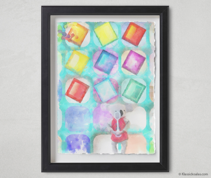 This is an actual watercolor painting fashioned after scenes in our Magic Koalas game. Derived from a print, the artwork may also contain a combination of pastel and colored pencil applications. The acid-free, cold pressed watercolor paper gets torn by hand to yield deckled-edges, for a true fine art appeal. The images gets painted in a manner that is reminiscent of traditional watercolor techniques, rendering it virtually indistinguishable from expensive commissions. The picture is framed in a box art frame designed to avoid contact with the art to help preserve the image. The painting will arrive ready to hang, yet is easily interchangeable with a frame of your own choice. Solid framing methods ensure the work is well-protected for generations to come, if kept inside of a home with temperate conditions. Avoid exposure to extreme heat or dropping the artwork on the floor.