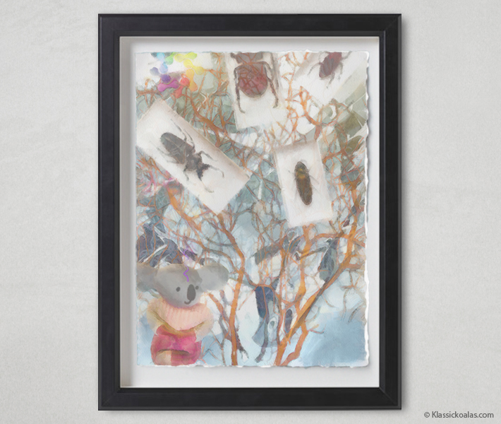 This is an actual watercolor painting fashioned after scenes in our Magic Koalas game. Derived from a print, the artwork may also contain a combination of pastel and colored pencil applications. The acid-free, cold pressed watercolor paper gets torn by hand to yield deckled-edges, for a true fine art appeal. The images gets painted in a manner that is reminiscent of traditional watercolor techniques, rendering it virtually indistinguishable from expensive commissions. The picture is framed in a box art frame designed to avoid contact with the art to help preserve the image. The painting will arrive ready to hang, yet is easily interchangeable with a frame of your own choice. Solid framing methods ensure the work is well-protected for generations to come, if kept inside of a home with temperate conditions. Avoid exposure to extreme heat or dropping the artwork on the floor.