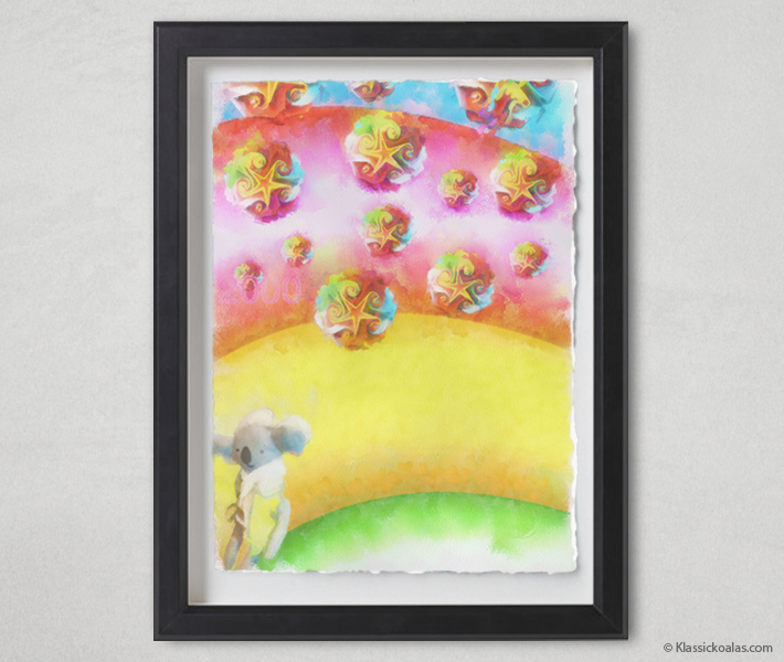 This is an actual watercolor painting fashioned after scenes in our Magic Koalas game. Derived from a print, the artwork may also contain a combination of pastel and colored pencil applications. The acid-free, cold pressed watercolor paper gets torn by hand to yield deckled-edges, for a true fine art appeal. The images gets painted in a manner that is reminiscent of traditional watercolor techniques, rendering it virtually indistinguishable from expensive commissions. The picture is framed in a box art frame designed to avoid contact with the art to help preserve the image. The painting will arrive ready to hang, yet is easily interchangeable with a frame of your own choice. Solid framing methods ensure the work is well-protected for generations to come, if kept inside of a home with temperate conditions. Avoid exposure to extreme heat or dropping the artwork on the floor.