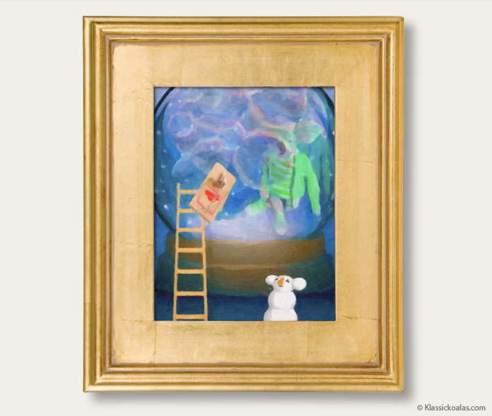 This is an actual painting fashioned after a scene from our Snow Koalas game. A uniquely formulated bees-wax based painting technique emulates the look and feel of an actual oil painting, yet the product can ship quickly without long drying times and be enjoyed much sooner. The picture is painted in a realistic manner with noticeable underpainting and brush strokes, virtually indistinguishable from an expensive gallery piece. Solid framing methods ensure the work is well-protected for generations to come, if kept inside of a home with temperate conditions. Arriving at your door, is a professionally mounted, classic oil painting frame of a driftwood color with gold leaf undertones one might find in a high-end gallery. Please avoid exposure to extreme heat or dropping the artwork on the floor.