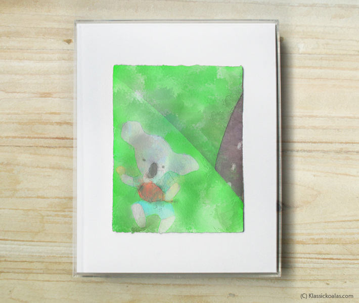 This is an actual watercolor painting fashioned after screens in our Space Koalas game. Derived from a print, the artwork may also contain a combination of pastel and colored pencil applications. The acid-free, cold pressed watercolor paper gets torn by hand to yield deckled-edges, for a true fine art appeal. Trained artists paint the final image in a manner that is reminiscent of traditional watercolor techniques, rendering it virtually indistinguishable from expensive commissions. The picture is framed in a box art frame designed to avoid contact with the art to help preserve the image. The painting will arrive ready to hang, yet is easily exchangeable with a frame of your own choice. Solid framing methods ensure the work is well-protected for generations to come, if kept inside of a home with temperate conditions. Avoid exposure to extreme heat or dropping the artwork on the floor.