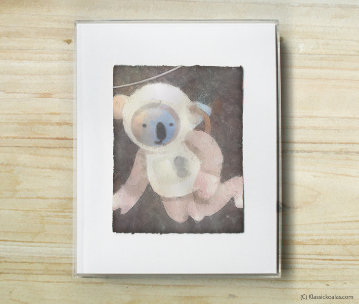 This is an actual watercolor painting fashioned after screens in our Space Koalas game. Derived from a print, the artwork may also contain a combination of pastel and colored pencil applications. The acid-free, cold pressed watercolor paper gets torn by hand to yield deckled-edges, for a true fine art appeal. Trained artists paint the final image in a manner that is reminiscent of traditional watercolor techniques, rendering it virtually indistinguishable from expensive commissions. The picture is framed in a box art frame designed to avoid contact with the art to help preserve the image. The painting will arrive ready to hang, yet is easily exchangeable with a frame of your own choice. Solid framing methods ensure the work is well-protected for generations to come, if kept inside of a home with temperate conditions. Avoid exposure to extreme heat or dropping the artwork on the floor.