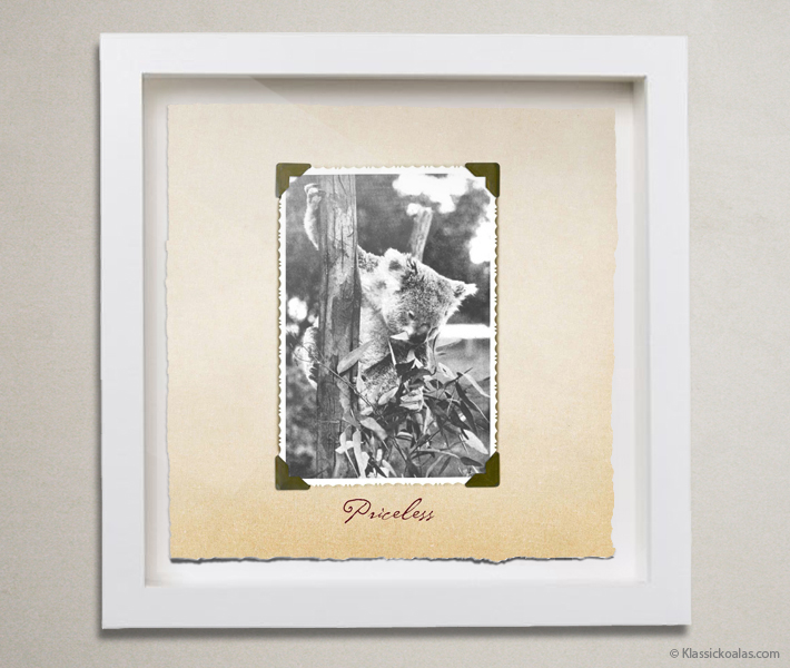 Let us turn this koala expression from the book KLASSIC KOALAS: THE BOOK OF VALENTINES AND OTHER LOVES, into a shiny, ten-inch square shadow box. The art is printed with archival quality inks that provide a vibrant gamut and accurate color resolution. Acid-free watercolor paper gets torn by hand to yield deckled-edges, for a true fine art appeal. The frame ensure the work is well-protected for generations to come, if kept inside of a home with temperate conditions. Please avoid exposure to extreme heat or dropping the artwork on the floor.