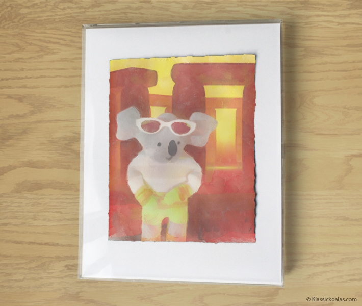 This is an actual watercolor painting fashioned after screens in our Magic Koalas game. Derived from a print, the artwork may also contain a combination of pastel and colored pencil applications. The acid-free, cold pressed watercolor paper gets torn by hand to yield deckled-edges, for a true fine art appeal. The images gets painted in a manner that is reminiscent of traditional watercolor techniques, rendering it virtually indistinguishable from expensive commissions. The picture is framed in a box art frame designed to avoid contact with the art to help preserve the image. The painting will arrive ready to hang, yet is easily exchangeable with a frame of your own choice. Solid framing methods ensure the work is well-protected for generations to come, if kept inside of a home with temperate conditions. Avoid exposure to extreme heat or dropping the artwork on the floor.