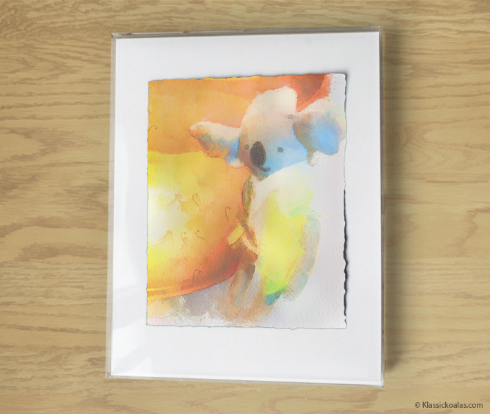 This is an actual watercolor painting fashioned after screens in our Magic Koalas game. Derived from a print, the artwork may also contain a combination of pastel and colored pencil applications. The acid-free, cold pressed watercolor paper gets torn by hand to yield deckled-edges, for a true fine art appeal. The images gets painted in a manner that is reminiscent of traditional watercolor techniques, rendering it virtually indistinguishable from expensive commissions. The picture is framed in a box art frame designed to avoid contact with the art to help preserve the image. The painting will arrive ready to hang, yet is easily exchangeable with a frame of your own choice. Solid framing methods ensure the work is well-protected for generations to come, if kept inside of a home with temperate conditions. Avoid exposure to extreme heat or dropping the artwork on the floor.