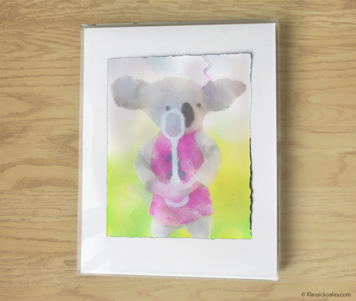 This is an actual watercolor painting fashioned after screens in our Magic Koalas game. Derived from a print, the artwork may also contain a combination of pastel and colored pencil applications. The acid-free, cold pressed watercolor paper gets torn by hand to yield deckled-edges, for a true fine art appeal. The images gets painted in a manner that is reminiscent of traditional watercolor techniques, rendering it virtually indistinguishable from expensive commissions. The picture is framed in a box art frame designed to avoid contact with the art to help preserve the image. The painting will arrive ready to hang, yet is easily exchangeable with a frame of your own choice. Solid framing methods ensure the work is well-protected for generations to come, if kept inside of a home with temperate conditions. Avoid exposure to extreme heat or dropping the artwork on the floor.