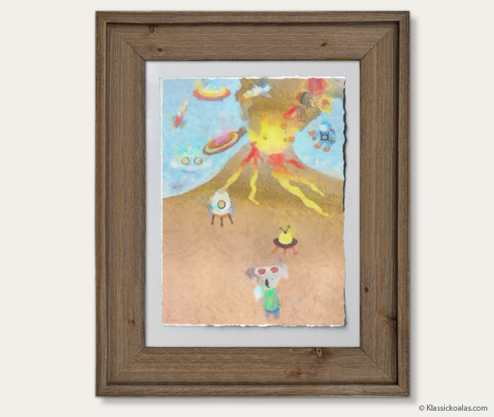 This is an actual watercolor painting fashioned after screens in our Space Koalas game. Derived from a print, the artwork may also contain a combination of pastel and colored pencil applications. The acid-free, cold pressed watercolor paper gets torn by hand to yield deckled-edges, for a true fine art appeal. Trained artists paint the final image in a manner that is reminiscent of traditional watercolor techniques, rendering it virtually indistinguishable from expensive commissions. The picture is framed in a box art frame designed to avoid contact with the art to help preserve the image. The painting will arrive ready to hang, yet is easily exchangeable with a frame of your own choice. Solid framing methods ensure the work is well-protected for generations to come, if kept inside of a home with temperate conditions. Avoid exposure to extreme heat or dropping the artwork on the floor.