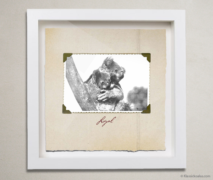 Let us turn this koala expression from the book KLASSIC KOALAS: THE BOOK OF VALENTINES AND OTHER LOVES, into a shiny, ten-inch square shadow box. The art is printed with archival quality inks that provide a vibrant gamut and accurate color resolution. Acid-free watercolor paper gets torn by hand to yield deckled-edges, for a true fine art appeal. The frame ensure the work is well-protected for generations to come, if kept inside of a home with temperate conditions. Please avoid exposure to extreme heat or dropping the artwork on the floor.